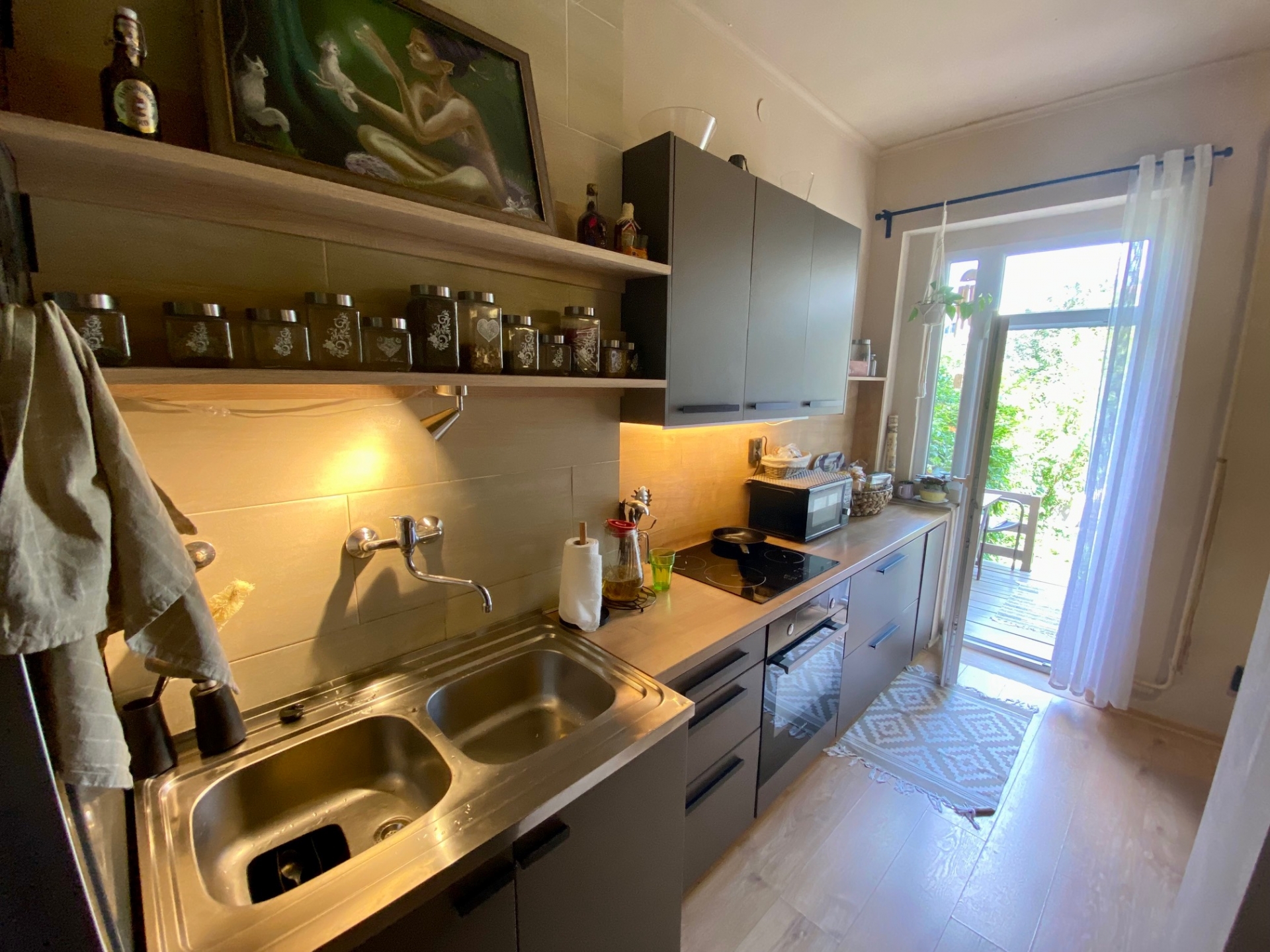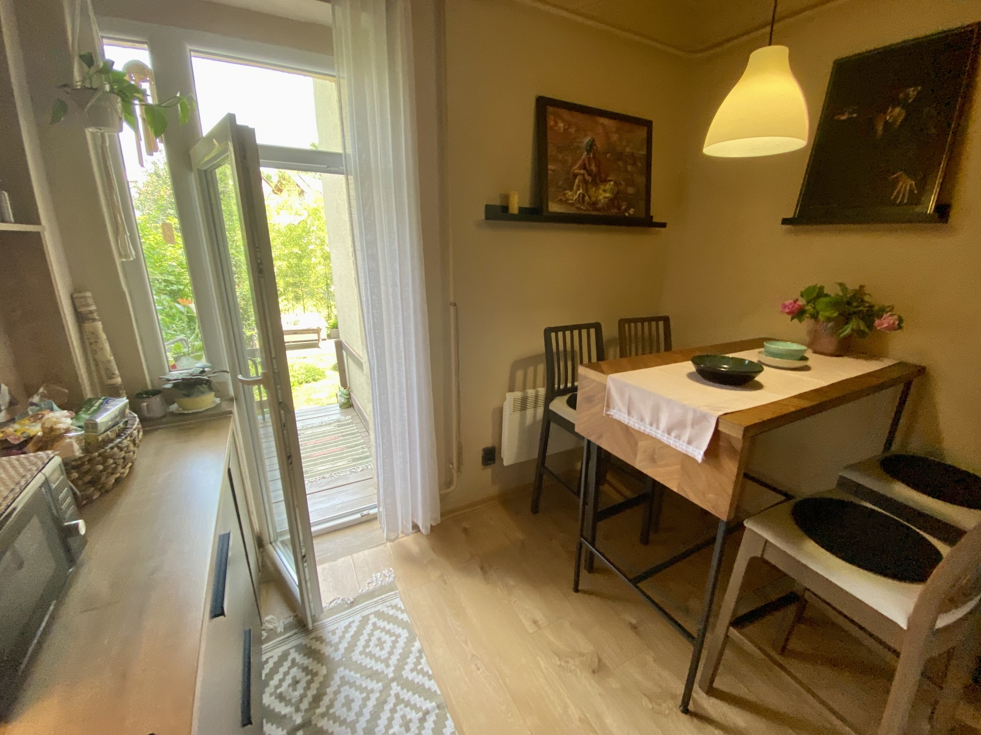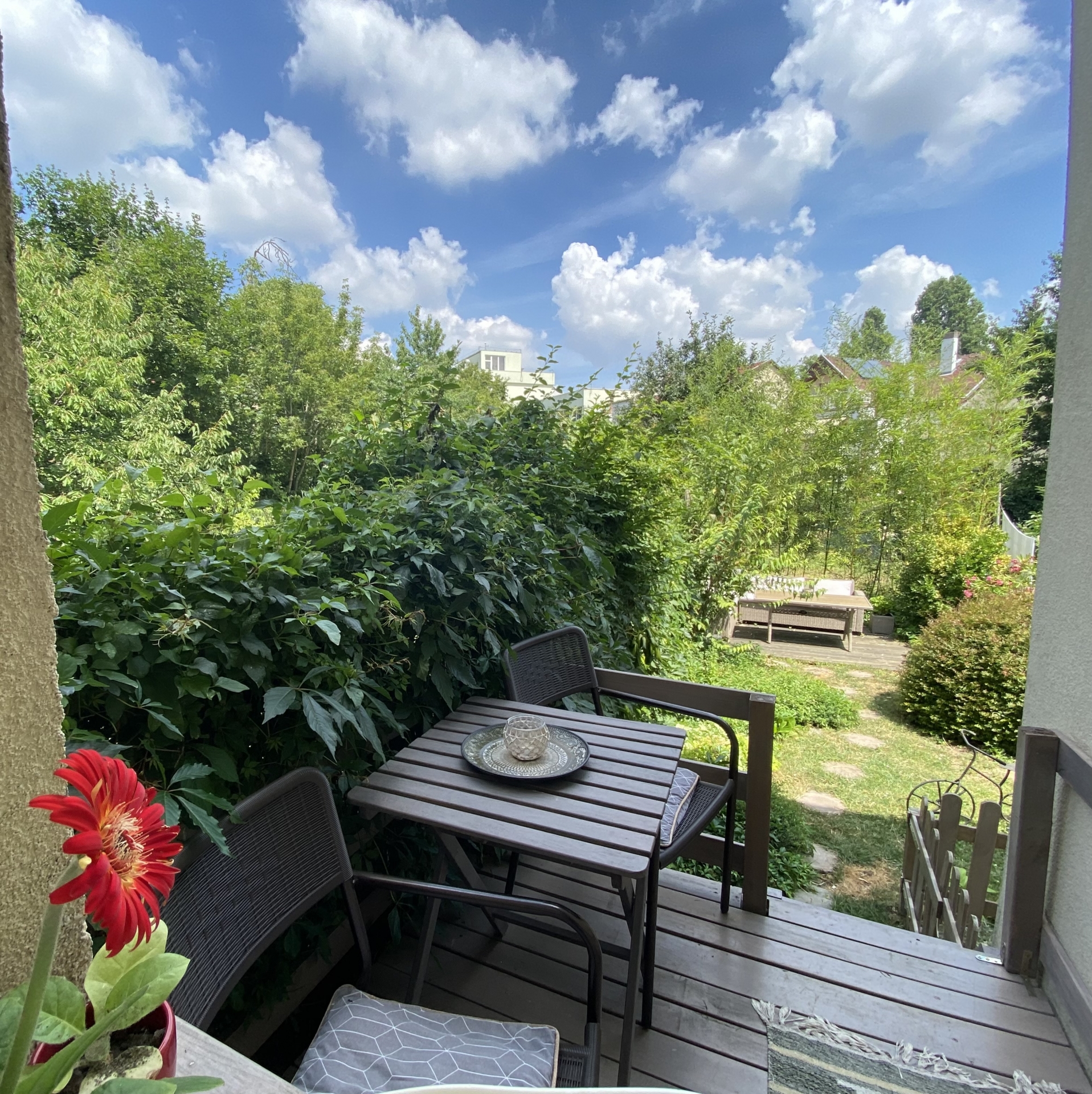 A lakás bejárata zárt lépcsőházból nyílik és a lakásból tehát közvetlen és saját kertkapcsolat lett kialakítva, a jelenlegi étkezős konyhából közvetlenül egy nagyon hangulatos kis saját teraszra léphetünk ki, amelyről pár lépcsővel közvetlenül a saját, elkerített kertrészünkbe sétálhatunk ki.