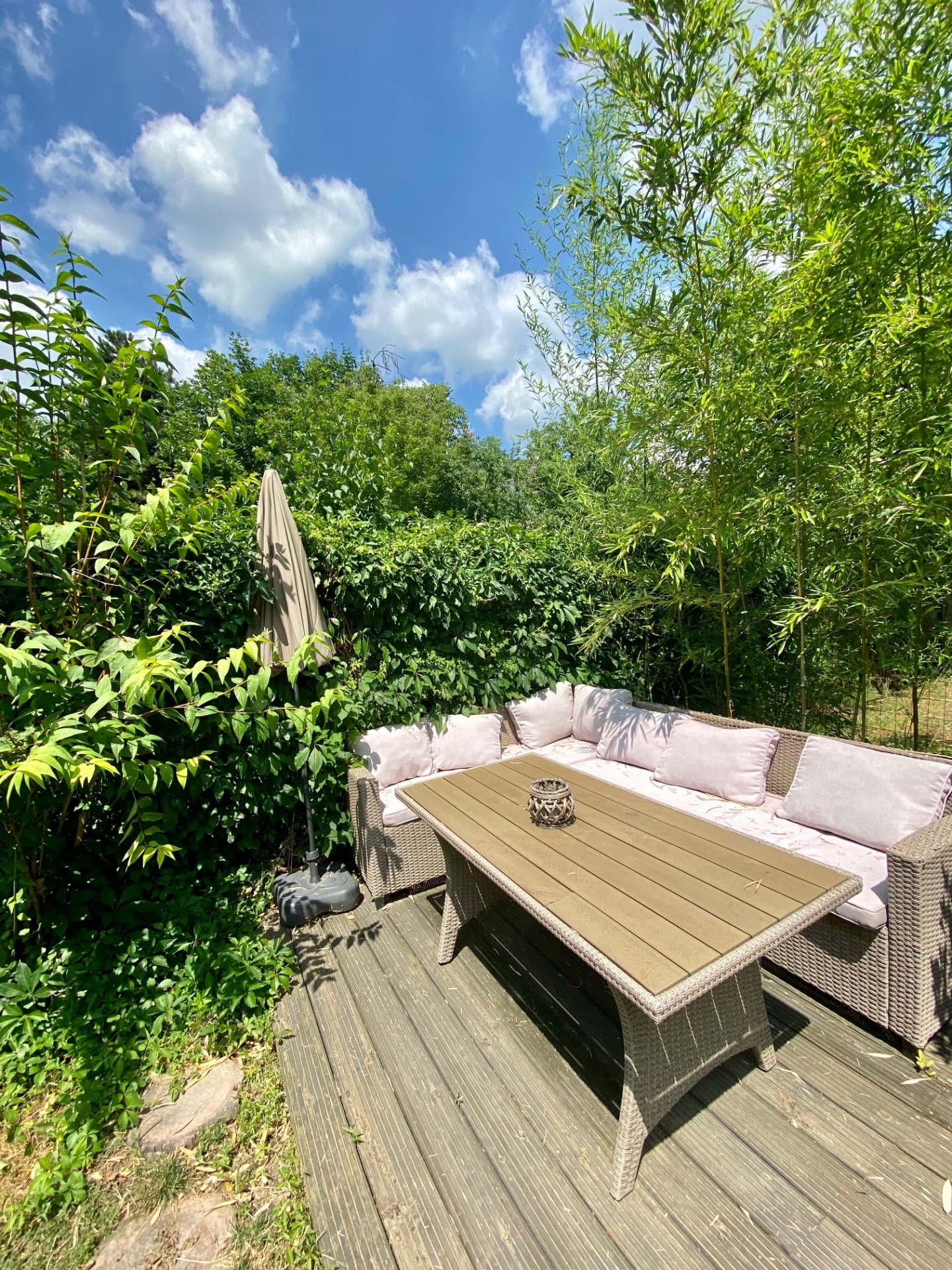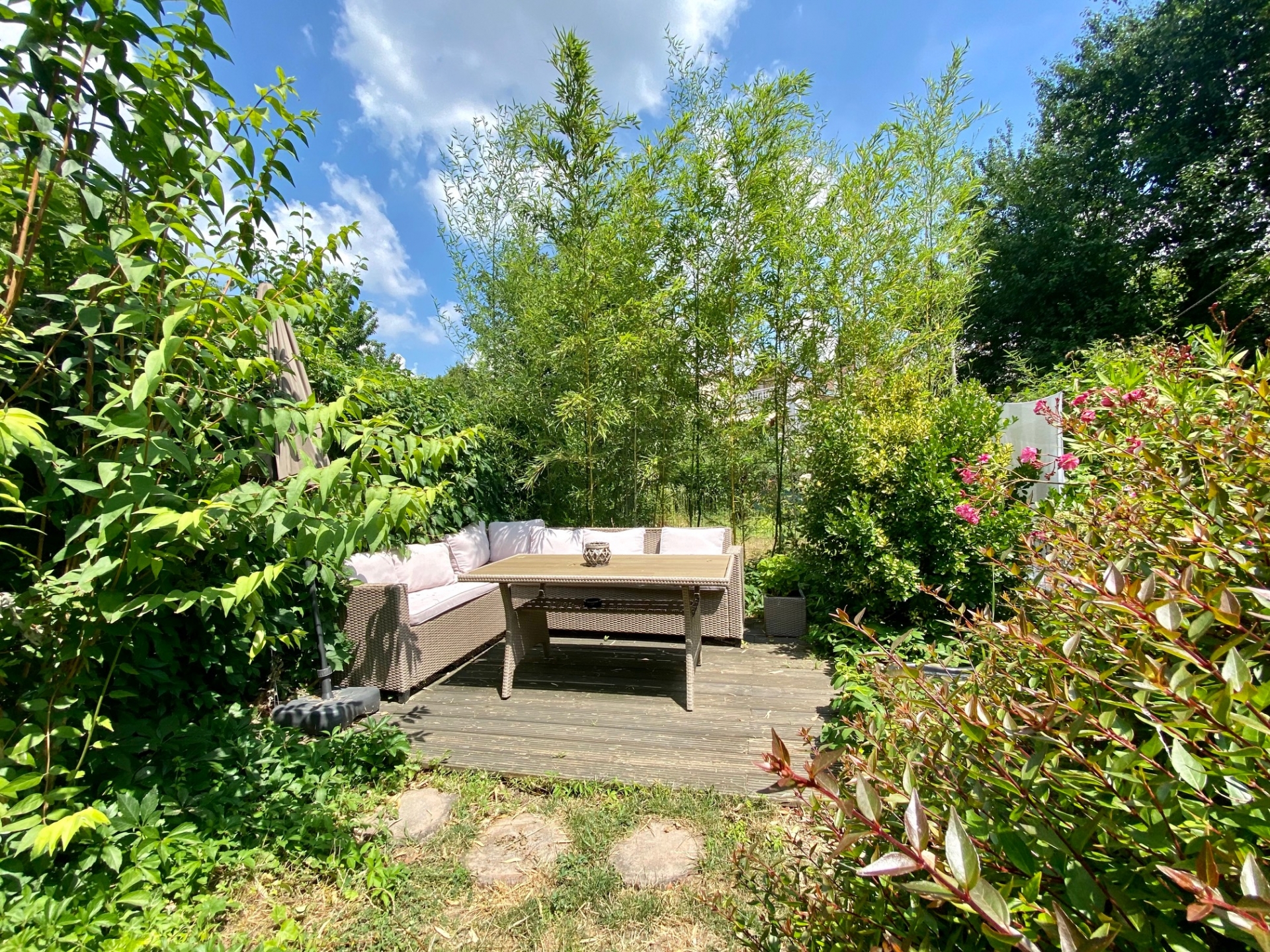 Ennek az ingatlannak a külön sajátossága, hogy a lakás kert felőli részén egy saját kis teraszra léphetünk ki, amelyből közvetlen saját lépcsőlejárat vezet a kizárólagos használatú saját kertrészbe, azaz közvetlenül saját kertkapcsolattal rendelkezik.