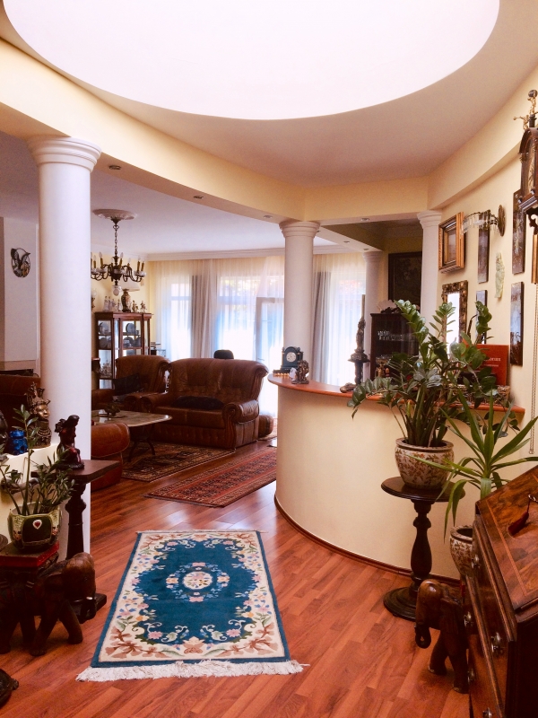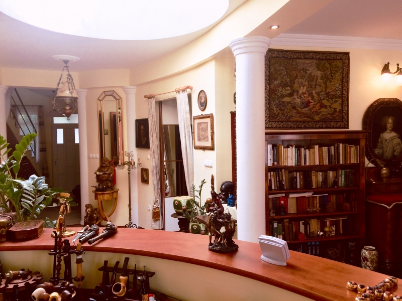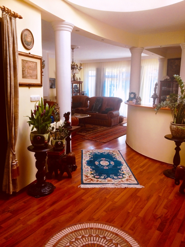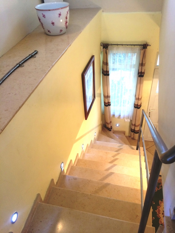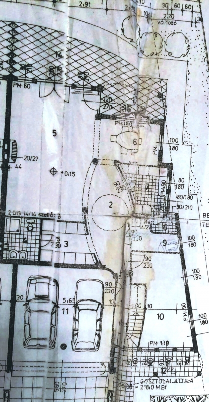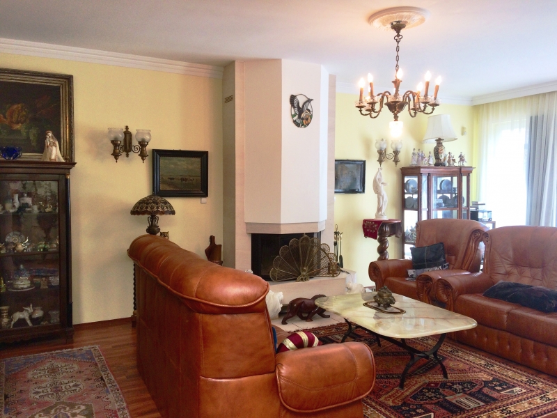 Földszint : nappali kandallóval 34 m2, konyha 7 m2, étkező 10 m2, dolgozószoba 18 m2, kondiszoba 9 m2, fürdőszoba, gardrób, dupla garázs 33 m2.