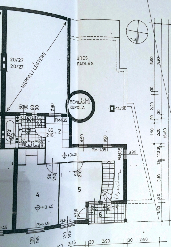 A tágas közlekedő és a déli fekvésű nappali felett 220 cm átmérőjű dupla héjú felülvilágító kupola van.