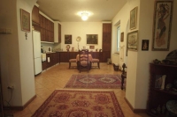 A középső, úgynevezett földszinti, 90 m2-es lakásban jelenleg 2 szoba, 1 hálószoba, egy hatalmas étkezős konyha, saját fürdőszoba és WC található. Ezen a szinten helyezkedik el az utcai lejárón keresztül a kertből közvetlenül megközelíthető 2 db. garázs. Az egyik 1 gépkocsi, a másik 3 db. gépkocsi beállására nyújt zárt és biztonságos lehetőséget.