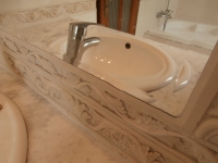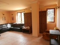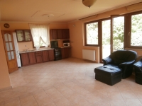 A közvetlen kertkapcsolatos, dupla teraszos földszinti részen található egy hatalmas, amerikai konyhás nappali, egy külön kamra, külön WC, külön sarokkádas fürdőszoba, 1 külön háztartási tároló helyiség és egy további hálószoba. Itt, a földszinti nappaliban egy szabadon felhasználható kémény csatlakozás önálló, szilárdtüzelésű kandalló utólagos beépítésére is lehetőséget ad.