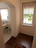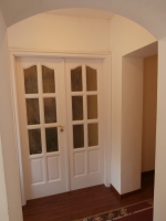 A fűtött belső lépcsőházból juthatunk az első emeleti részre, ahol található egy központi helyen lévő, részben még beépítendő konyha, egy nagy előtér, folyosó, amelyről nyílik egy hatalmas utcafronti nappali egy nagyméretű erkéllyel, egy külön bejárattal rendelkező hálószoba, egy külön WC és egy külön fürdőszoba, amely káddal, mosdóval és egy elektromos törülköző radiátorral van felszerelve.